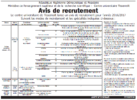 Recrutement centre universitaire de tissemsilt
